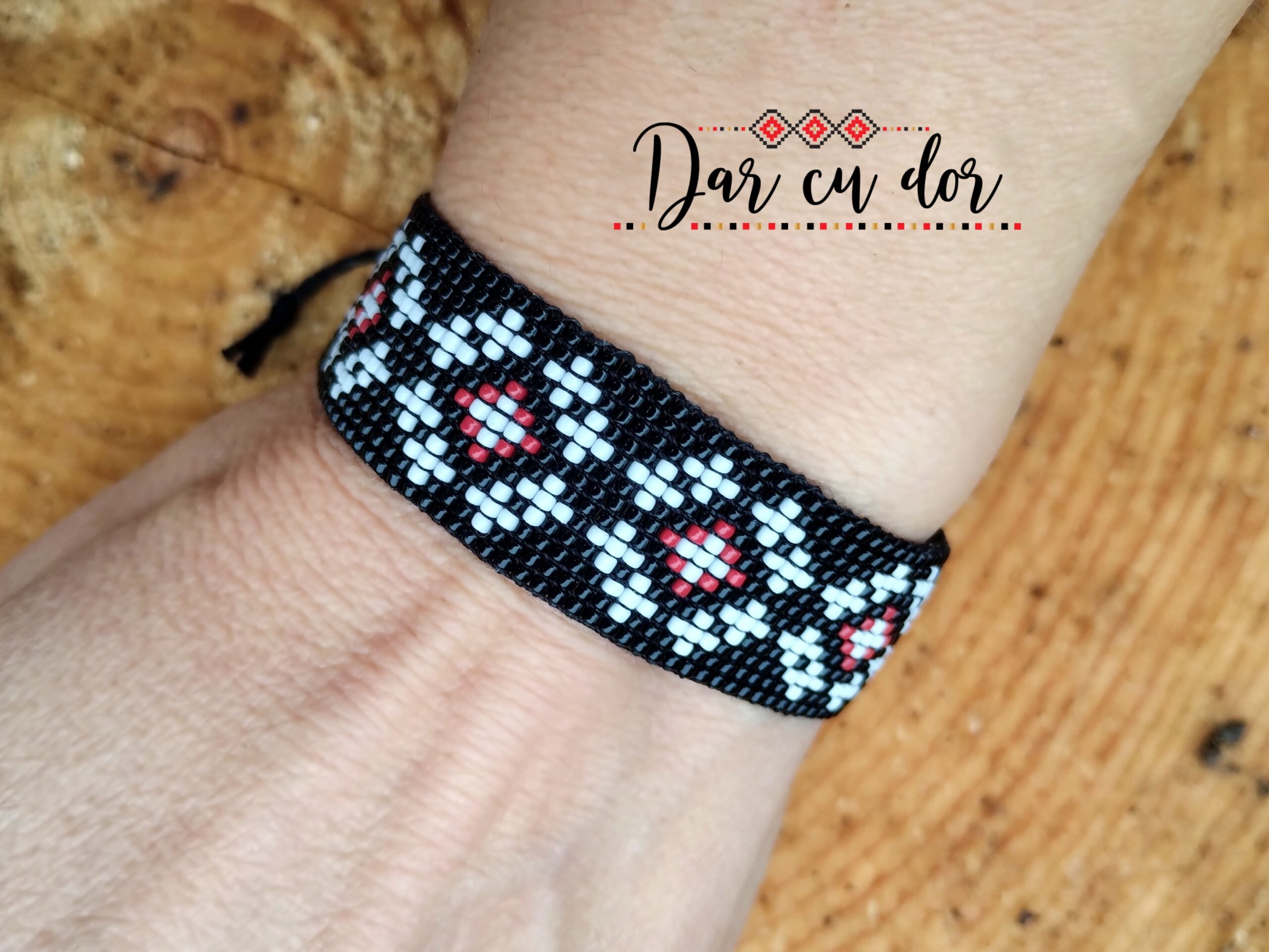 Brăţări cu mărgele fine. Brățările cu motive tradiţionale „Dar cu dor” din această categorie sunt realizate cu mărgele de nisip de 1,4 mm, cele mai mărunte existente, alese pentru a obţine detalii foarte fine. Mărgelele sunt de fabricație japoneză, au o calitate superioară, în culori vii şi luminoase care nu se șterg în timp iar aţa folosită este deosebit de rezistentă. Spre deosebire de mărgelele normale, aici suprafața produsului dă senzația de fin, de catifelat iar modelele sunt mai detaliate și bogate. Majoritatea lor au motive deosebite de ceea ce se găseşte ca tradiţional la tarabe. Nu sunt reproduceri ale bijuteriilor vechi, ci sunt compuneri noi din motive preluate de pe diverse elemente de artă populară. Câteva brăţări au motive originale. Sunt realizate cu mărgele de calitate, ceea ce se reflectă în ordonarea lor aproape perfectă, care fură privirea. Brăţările „Dar cu dor” sunt ţesute sau cusute. Ţesutul este o tehnică tradiţională românească, în vreme ce tehnica de cusut nu. Aceasta se potriveşte foarte bine elementelor moderne: baze metalice pătrate sau dreptunghiulare ori terminaţii-tub argintate, preponderent din inox. Brăţările cu motive tradiţionale din mărgele „Dar cu dor” sunt potrivite atât la straie de sărbătoare cât şi la ţinute moderne, fiind foarte apreciate de cei care se află peste graniţe şi chiar de către străini, care privesc cu multă admiraţie arta noastră populară. Brățările cu nod reglabil pot fi deschise până la aproximativ 22-24 cm pentru a putea fi introdusă brăţara pe mână, cele cu închidere inox au lungimea de 16-17 cm și 4-5 cm prelungitor. Fiecare brăţară se livrează pe cartonaş-suport sau în săculeţ organza, ori contracost, în cutie cu suport special, disponibile în categoria Ambalaje.