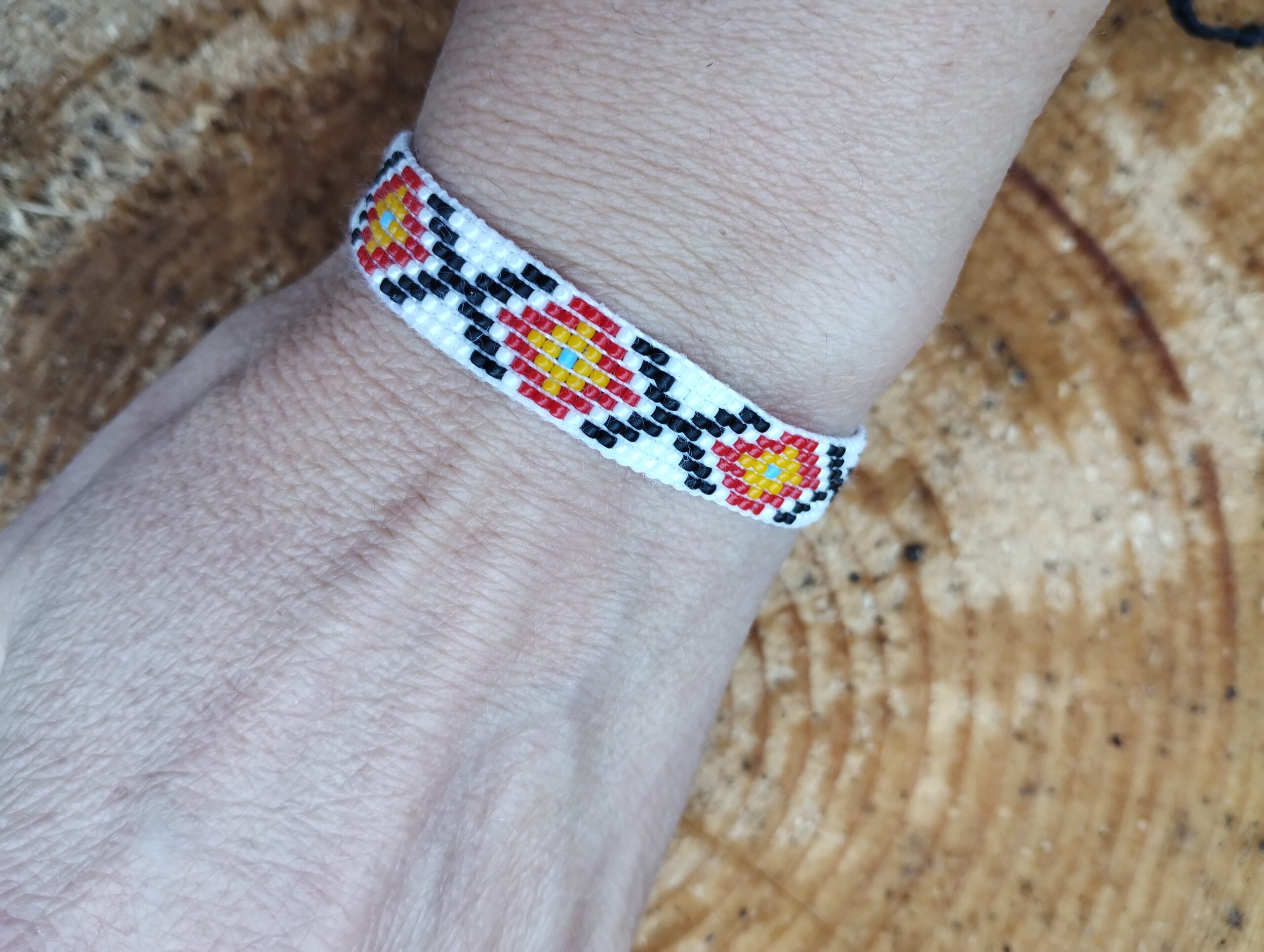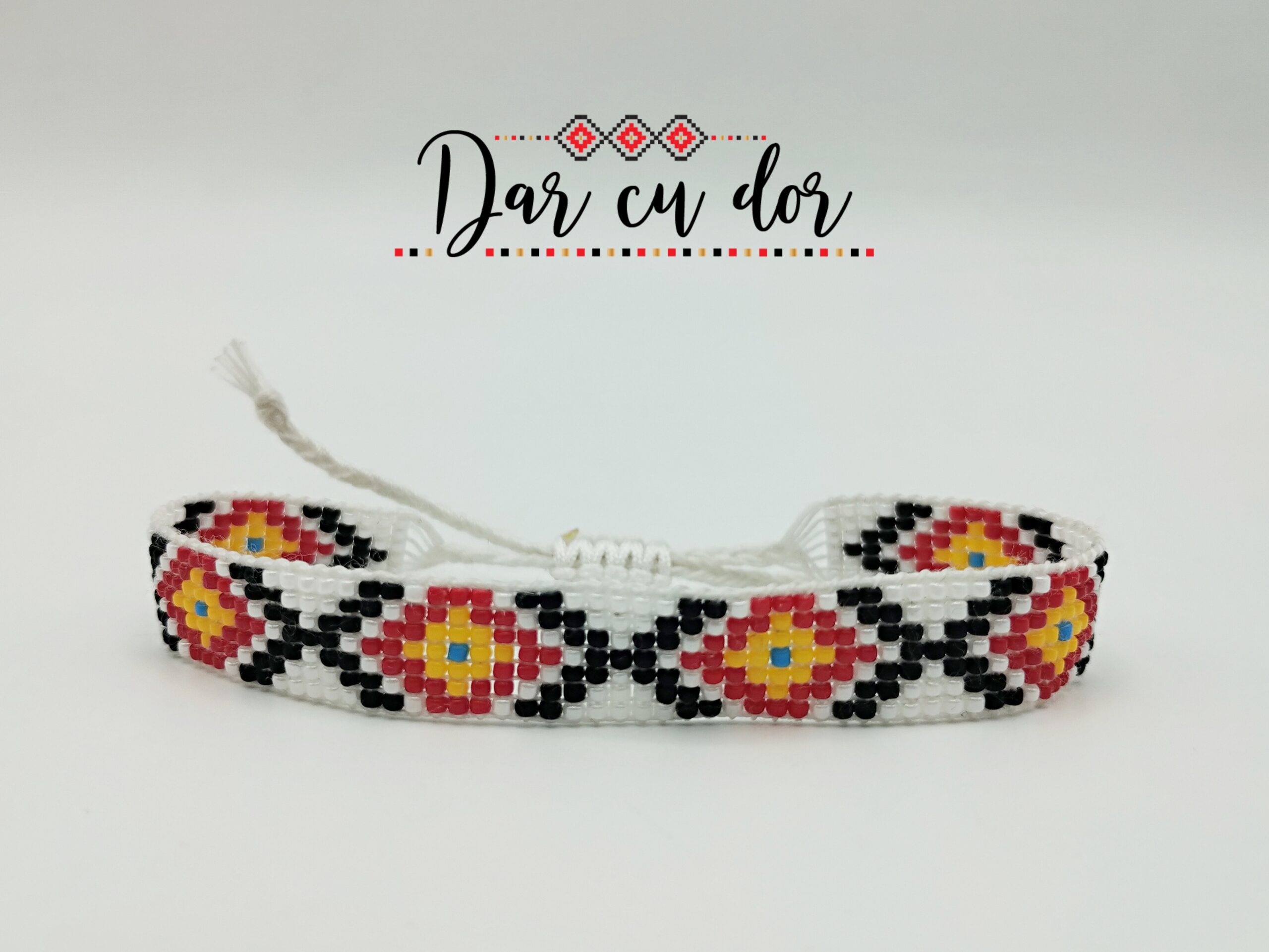 Brățară cu motiv tricolor, țesut cu mărgele foarte fine.